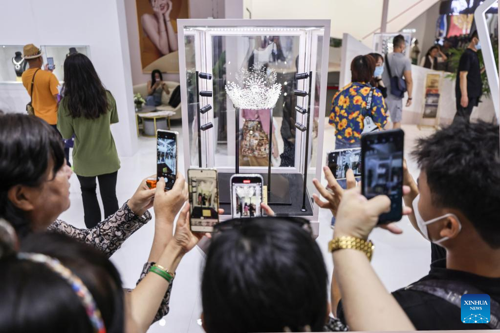Visitors take photos of a diamond exhibit at the third China International Consumer Products Expo (CICPE) in Haikou, capital city of south China's Hainan Province, on April 14, 2023. The expo opened to the public on Friday. (Xinhua/Zhang Liyun)