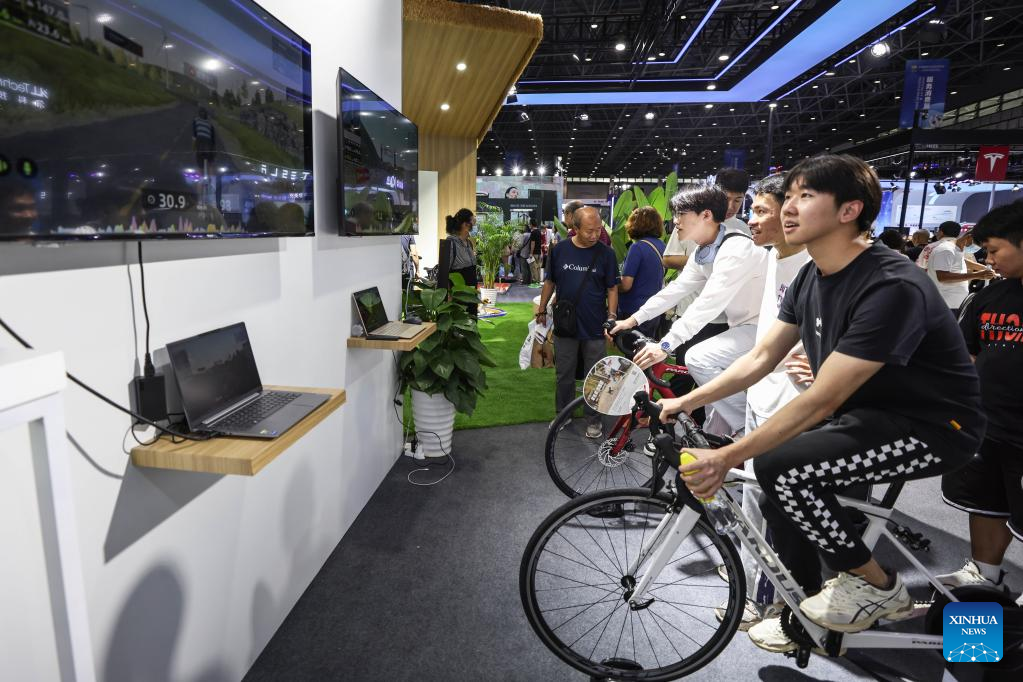 Visitors experience smart riding at the third China International Consumer Products Expo (CICPE) in Haikou, capital city of south China's Hainan Province, on April 14, 2023. The expo opened to the public on Friday. (Xinhua/Zhang Liyun)