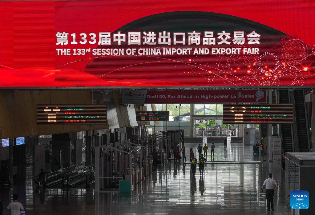 This photo taken on April 14, 2023 shows a view of the venue for the 133rd session of China Import and Export Fair in Guangzhou, south China's Guangdong Province. This event, also known as the Canton Fair, will be held in the southern Chinese city of Guangzhou from April 15 to May 5. All the preparations for the event have been finished by now. (Xinhua/Liu Dawei)