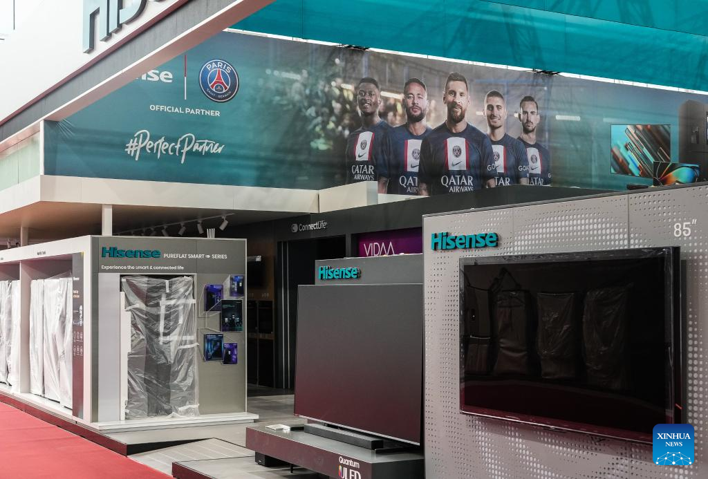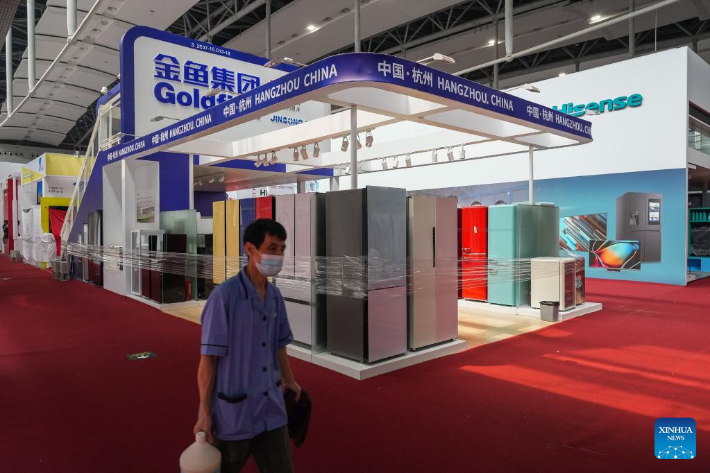 This photo taken on April 14, 2023 shows a booth at the venue for the 133rd session of China Import and Export Fair in Guangzhou, south China's Guangdong Province. This event, also known as the Canton Fair, will be held in the southern Chinese city of Guangzhou from April 15 to May 5. All the preparations for the event have been finished by now. (Xinhua/Liu Dawei)