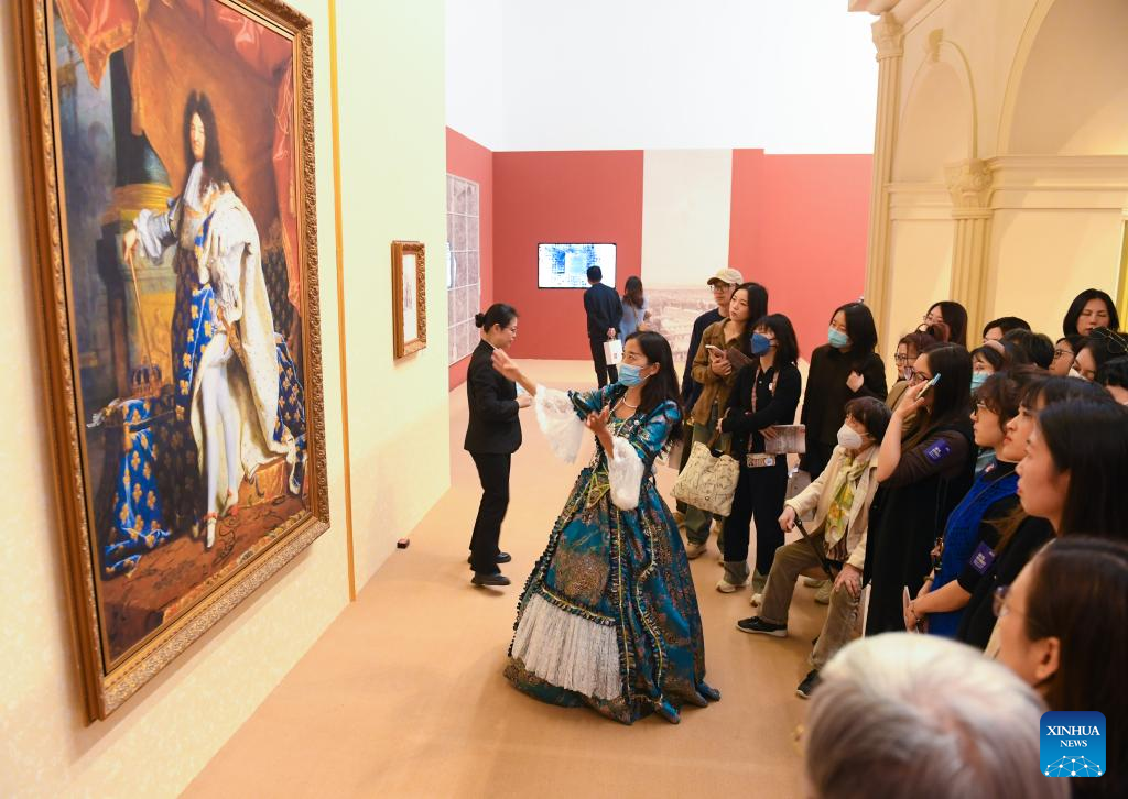 Visitors look at a replica of the portrait "Louis XIV (1638-1715), roi de France" and an etching of the original portrait at the Hangzhou Pavilion of the Meet You Museum in Hangzhou, East China's Zhejiang Province, April 14, 2023. The Hangzhou Pavilion of the Meet You Museum officially opened on Friday. Two exhibitions featuring artworks of well-known Western artists including Vincent van Gogh and Claude Monet were launched for the public on the opening day. (Xinhua/Weng Xinyang)