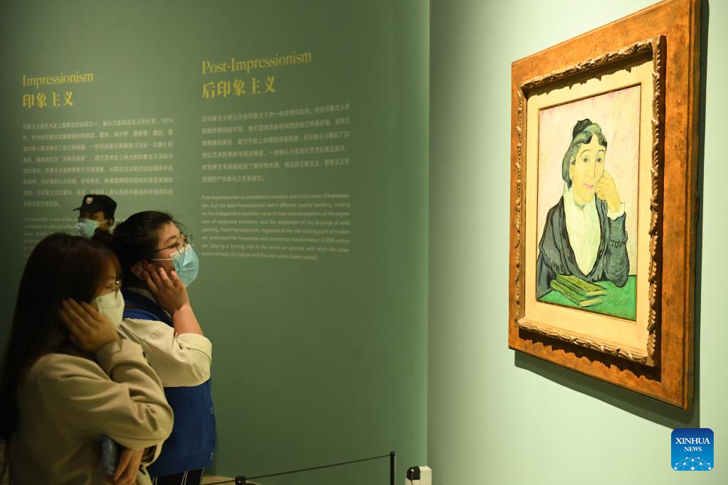 Visitors look at one of the portraits in the series "L'Arlesienne" by Vincent van Gogh at the Hangzhou Pavilion of the Meet You Museum in Hangzhou, East China's Zhejiang Province, April 14, 2023. The Hangzhou Pavilion of the Meet You Museum officially opened on Friday. Two exhibitions featuring artworks of well-known Western artists including Vincent van Gogh and Claude Monet were launched for the public on the opening day. (Xinhua/Weng Xinyang)