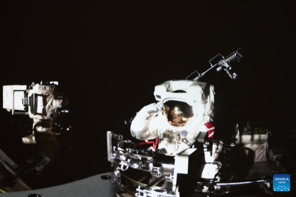 This screen image captured at Beijing Aerospace Control Center on April 15, 2023 shows Shenzhou-15 taikonaut Zhang Lu (below) exiting the Wentian lab module. The Shenzhou-15 taikonauts on board the orbiting Chinese Tiangong space station have completed their fourth spacewalk, the China Manned Space Agency said on Sunday. (Xinhua/Guo Zhongzheng)