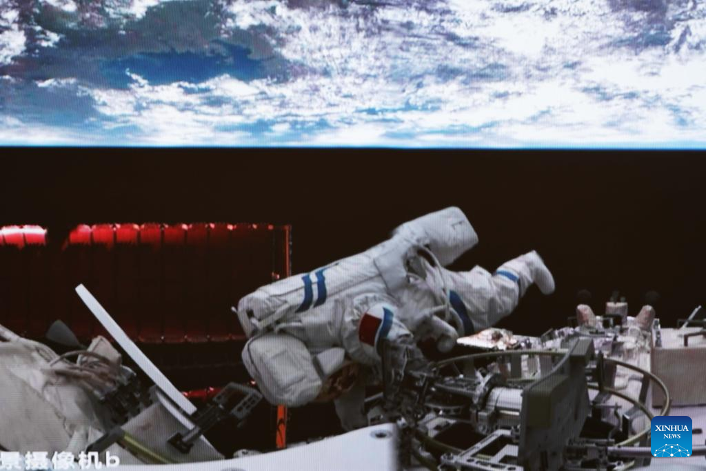 This screen image captured at Beijing Aerospace Control Center on April 15, 2023 shows Shenzhou-15 taikonaut Fei Junlong performing extravehicular activities outside the Wentian lab module. The Shenzhou-15 taikonauts on board the orbiting Chinese Tiangong space station have completed their fourth spacewalk, the China Manned Space Agency said on Sunday. (Xinhua/Guo Zhongzheng)
