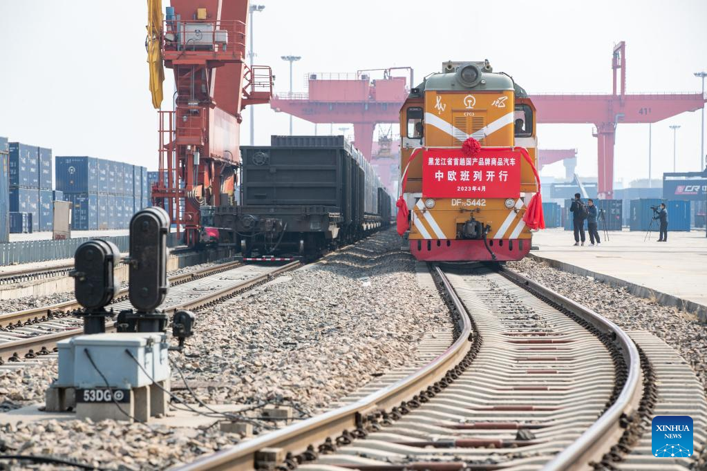 A China-Europe freight train loaded with Chinese-brand vehicles waits for departure at the Harbin international container center station in Harbin, capital of northeast China's Heilongjiang Province, on April 16, 2023. (Xinhua/Zhang Tao)