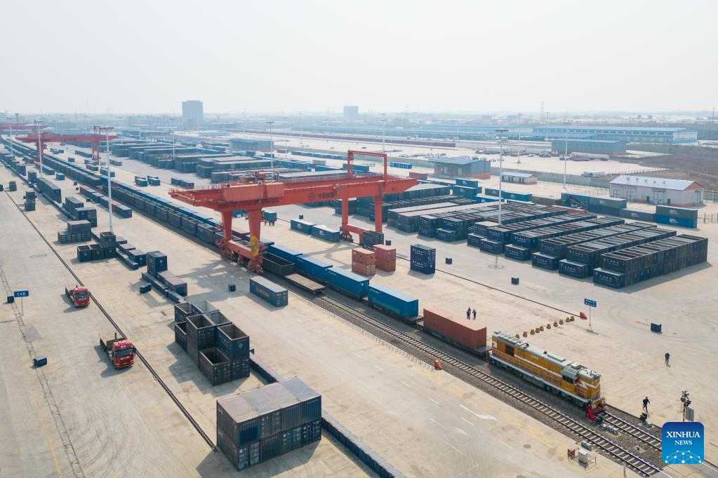 This aerial photo taken on April 16, 2023 shows a China-Europe freight train carrying Chinese-brand vehicles at Harbin international container center station in Harbin, capital of northeast China's Heilongjiang Province. (Xinhua/Zhang Tao)