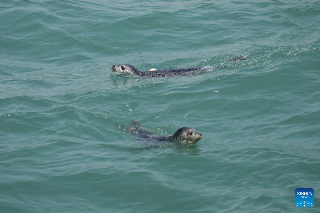 Spotted seals are released into the sea in Dalian, northeast China's Liaoning Province, April 16, 2023. A total of seven spotted seals were released into the sea on Sunday in the coastal city of Dalian. (Xinhua/Pan Yulong)