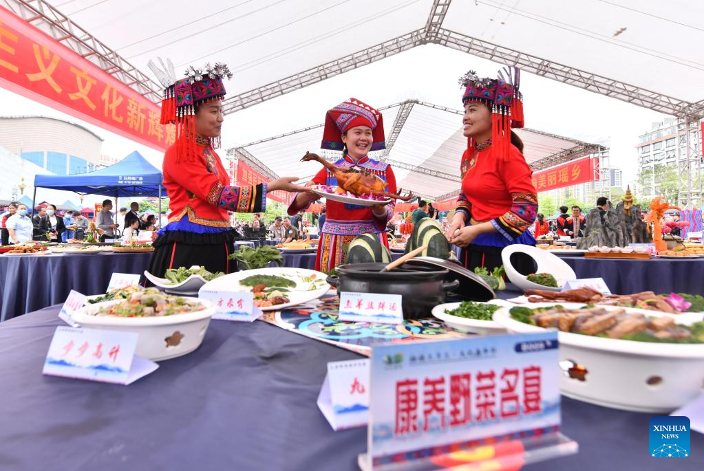 Candidates present their creations for a contest of specialty dishes at a cultural square in Dahua Yao Autonomous County, south China's Guangxi Zhuang Autonomous Region, April 15, 2023. A gourmet competition was held here on Saturday to mark the traditional Sanyuesan festival, which falls on the third day of the third month on the lunar calendar. Hundreds of dishes made with indigenous produces participated in the competition. (Xinhua/Huang Xiaobang)