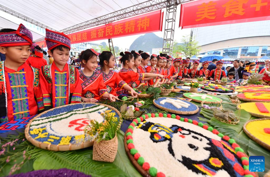 Primary school pupils watch candidate creations for a contest of colorful meals made with glutinous rice at a cultural square in Dahua Yao Autonomous County, south China's Guangxi Zhuang Autonomous Region, April 15, 2023. A gourmet competition was held here on Saturday to mark the traditional Sanyuesan festival, which falls on the third day of the third month on the lunar calendar. Hundreds of dishes made with indigenous produces participated in the competition. (Xinhua/Huang Xiaobang)
