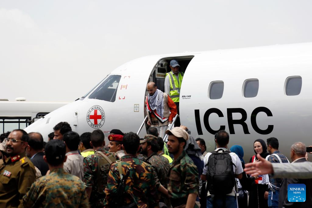A plane carrying released prisoners lands at the Sanaa airport in Sanaa, Yemen, April 16, 2023. In a significant step toward resolving the protracted conflict in Yemen, the country's warring factions successfully completed a massive exchange of prisoners on Sunday, with a total of 887 detainees swapped over three consecutive days. (Photo by Mohammed Mohammed/Xinhua)