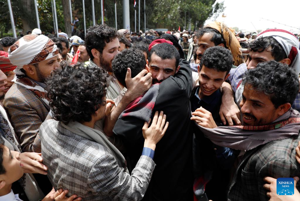 A released prisoner is welcomed at the Sanaa airport in Sanaa, Yemen, April 16, 2023. In a significant step toward resolving the protracted conflict in Yemen, the country's warring factions successfully completed a massive exchange of prisoners on Sunday, with a total of 887 detainees swapped over three consecutive days. (Photo by Mohammed Mohammed/Xinhua)