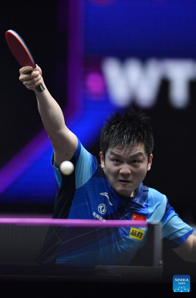 Fan Zhendong of China hits a return during the men's singles final against his compatriot Liang Jingkun at the WTT Champions Xinxiang 2023 in Xinxiang, central China's Henan Province, April 15, 2023. (Xinhua/Li Jianan)