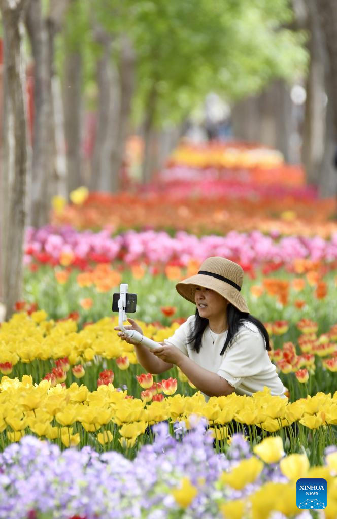A tourist takes photos of the blooming flowers by Yongding River in Daxing District of Beijing, capital of China, April 15, 2023. Colorful flowers of various species are in full bloom, attracting many tourists to spend their leisure time here. (Xinhua/Li Xin)