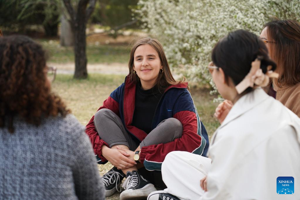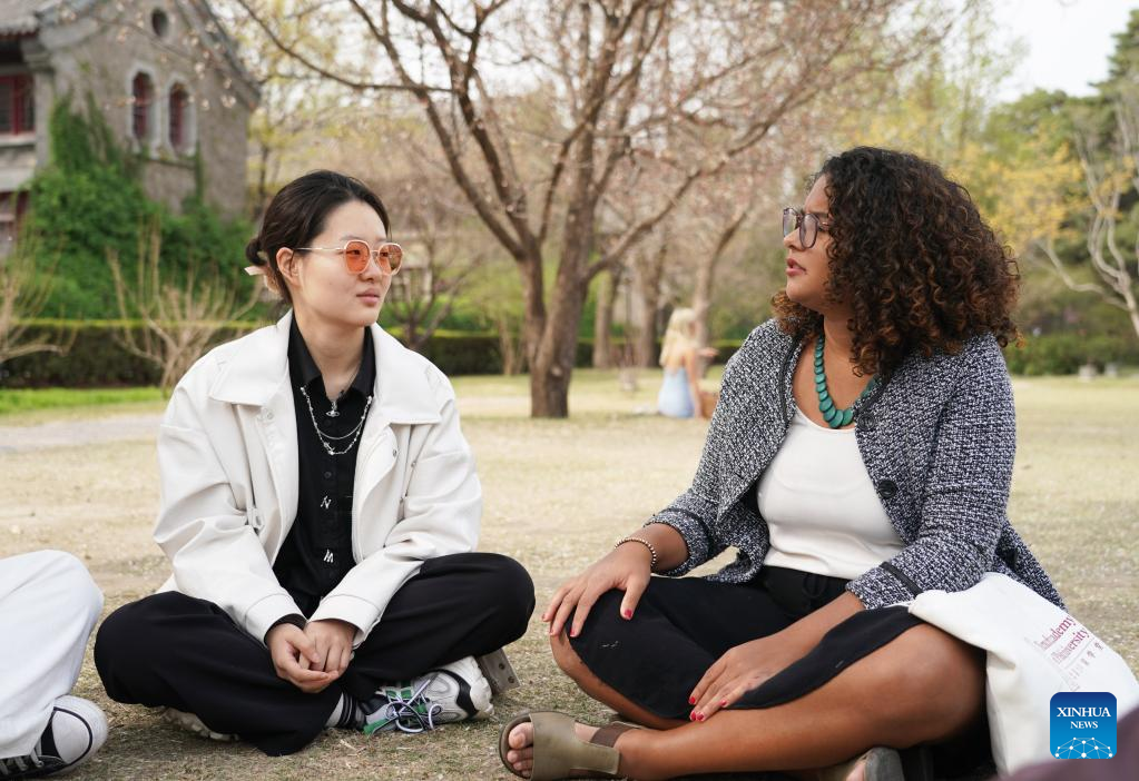 Maria (2nd L) chats with schoolmates at Peking University in Beijing, capital of China, March 31, 2023. (Xinhua/Ren Chao)