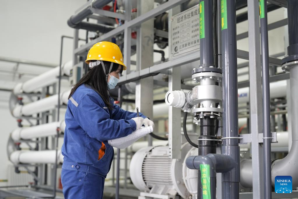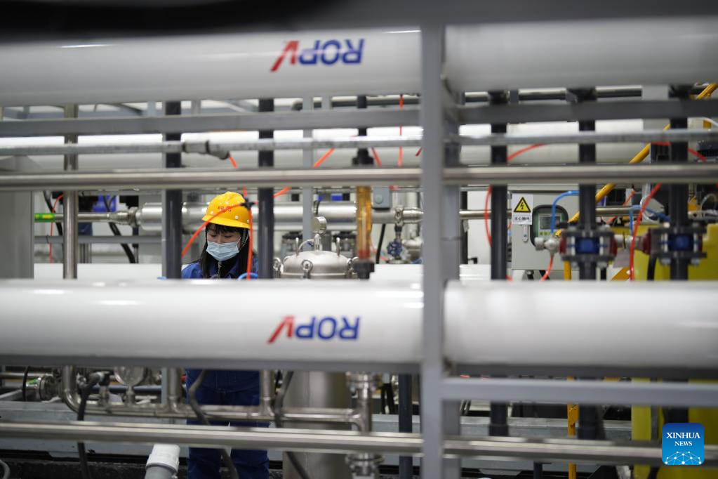 A worker checks the operation of a water purifying equipment in a waste leachate treatment center at Tangshan Jidong Qixin Cement Co., Ltd. in Tangshan, north China's Hebei Province, April 13, 2023. The history of Tangshan Jidong Qixin Cement Co., Ltd., formerly known as Tangshan Qixin Cement Plant, dates back to 1889. In recent years, the company has switched to a high-quality green development mode, achieving both economic and ecological benefits. (Xinhua/Mu Yu)