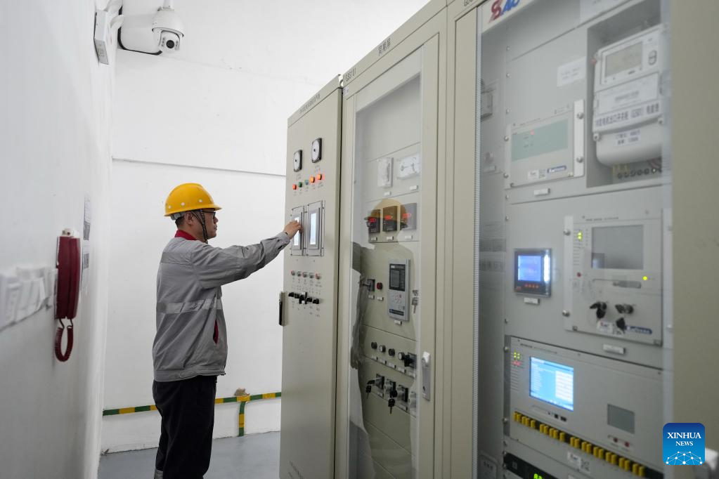 A staff member checks electricity generator status at Tangshan Jidong Qixin Cement Co., Ltd. in Tangshan, north China's Hebei Province, April 13, 2023. The history of Tangshan Jidong Qixin Cement Co., Ltd., formerly known as Tangshan Qixin Cement Plant, dates back to 1889. In recent years, the company has switched to a high-quality green development mode, achieving both economic and ecological benefits. (Xinhua/Mu Yu)
