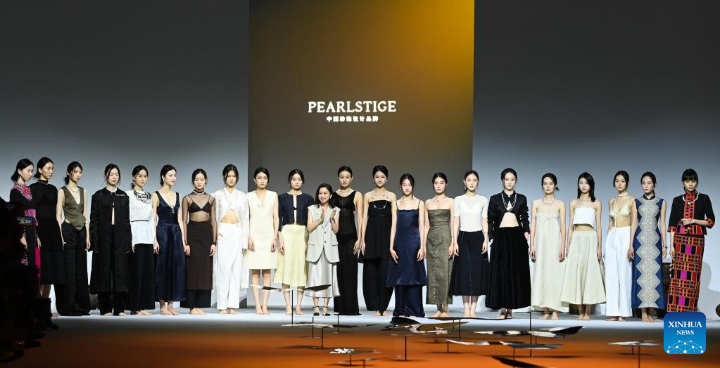 A fashion designer acknowledges the audience with models presenting her creations during the fashion week at the third China International Consumer Products Expo (CICPE) in Haikou, capital city of south China's Hainan Province, on April 15, 2023. The fashion week, scheduled from April 10 to 15, concluded on Saturday in Haikou. (Xinhua/Yang Guanyu)
