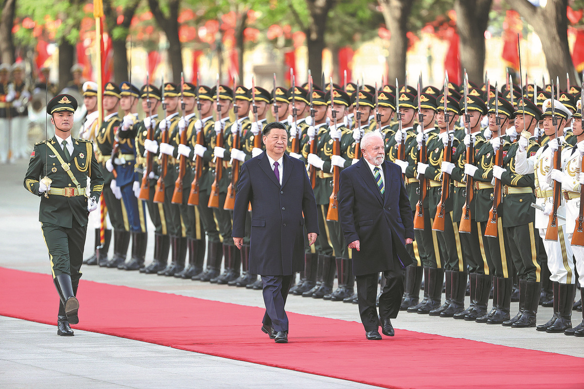 President Xi Jinping hosts a welcoming ceremony for visiting Brazilian President Luiz Inacio Lula da Silva before their talks at the Great Hall of the People in Beijing on Friday. [FENG YONGBIN/CHINA DAILY]