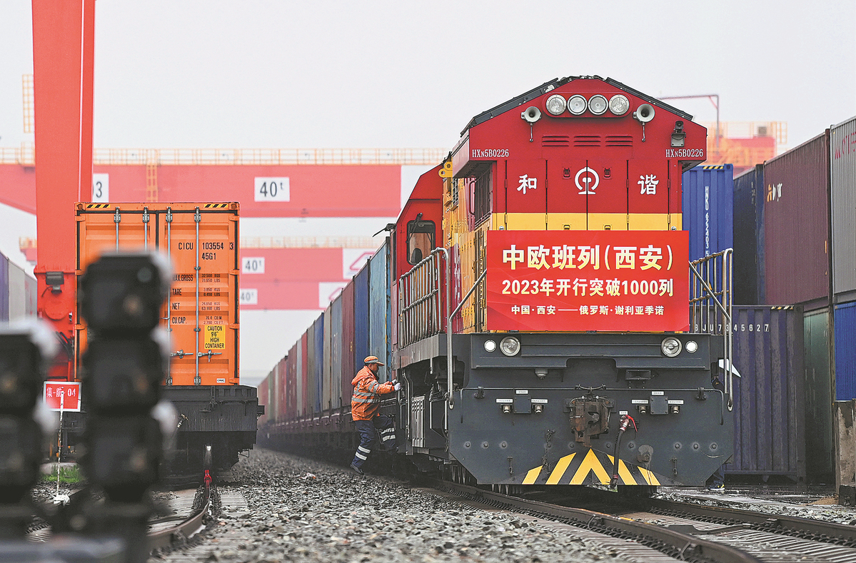 A China Railway Express train loaded with cars for export pulls out of the Xi'an International Port Station on its way to Russia on March 23. LI YIBO/XINHUA