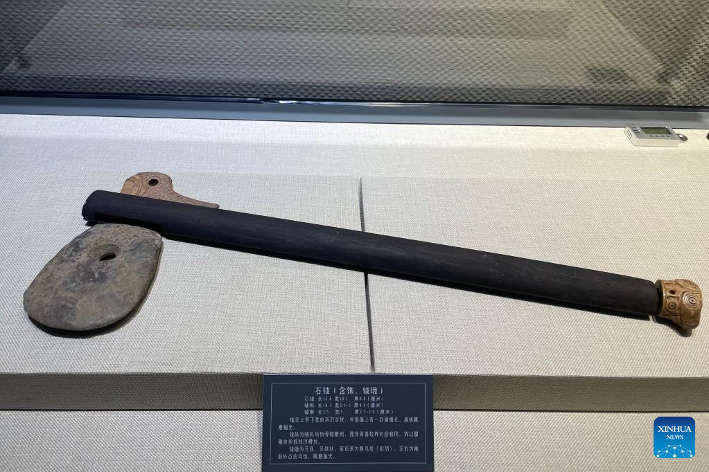 This photo taken on April 14, 2023 shows a stone axe on display at the Jintan museum in Jintan District of Changzhou, east China's Jiangsu Province. It was unearthed during the first excavation at Sanxingcun relic site. A second excavation was launched on Saturday at a neolithic site in east China's Jiangsu Province, three decades after the first one, which unearthed more than 4,000 items. (Xinhua/Zhu Guoliang)