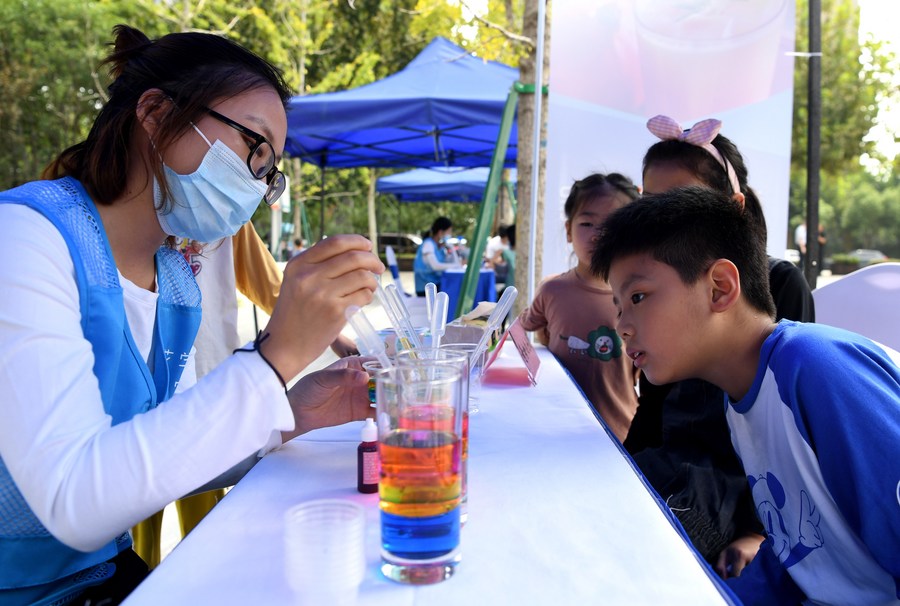 Students experience a liquid layering experiment during the National Science Popularization Day held in Baohe District of Hefei City, east China's Anhui Province, Sept. 20, 2020. (Xinhua/Liu Junxi)