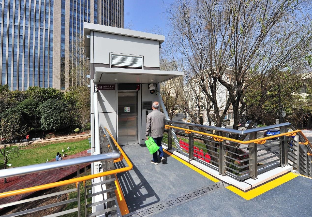 A senior citizen takes a barrier-free elevator on a pedestrian overpass in Shanghai. (People's Daily Online/Yang Jianzheng)