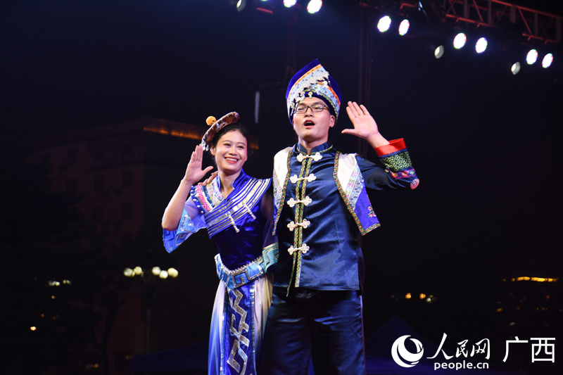 People present Maonan ethnic group costume at a fashion show held in Dahua Yao Autonomous County, Hechi city, south China's Guangxi Zhuang Autonomous Region. (People’s Daily Online/Wang Gongxiao)