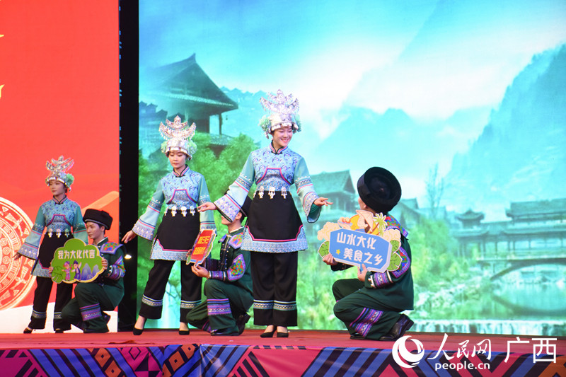 People present Shui ethnic group costume at a fashion show held in Dahua Yao Autonomous County, Hechi city, south China's Guangxi Zhuang Autonomous Region. (People’s Daily Online/Wang Gongxiao)