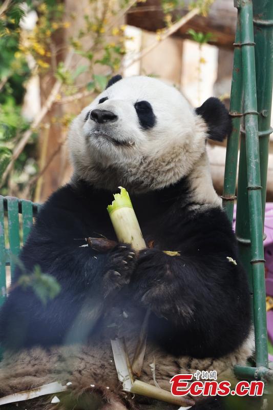Giant panda Meng Lan enjoys bamboo shoots at the Beijing Zoo, April 17, 2023. (Photo: China News Service/Han Haidan)