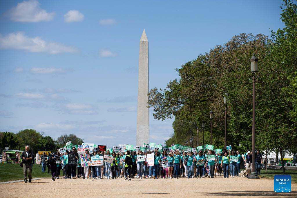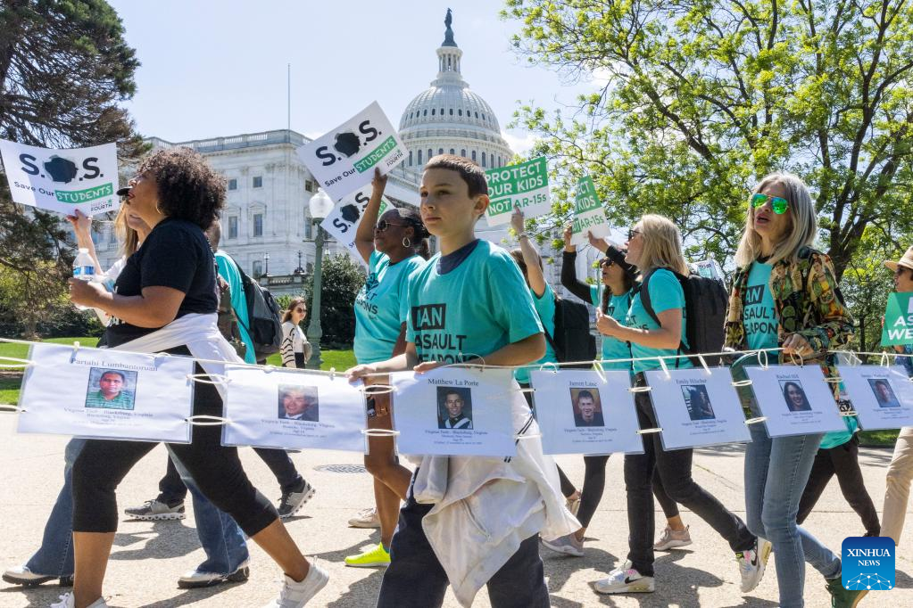People march to the Capitol to protest for a ban on assault weapons, in Washington, D.C., the United States, on April 17, 2023. (Photo by Aaron Schwartz/Xinhua)