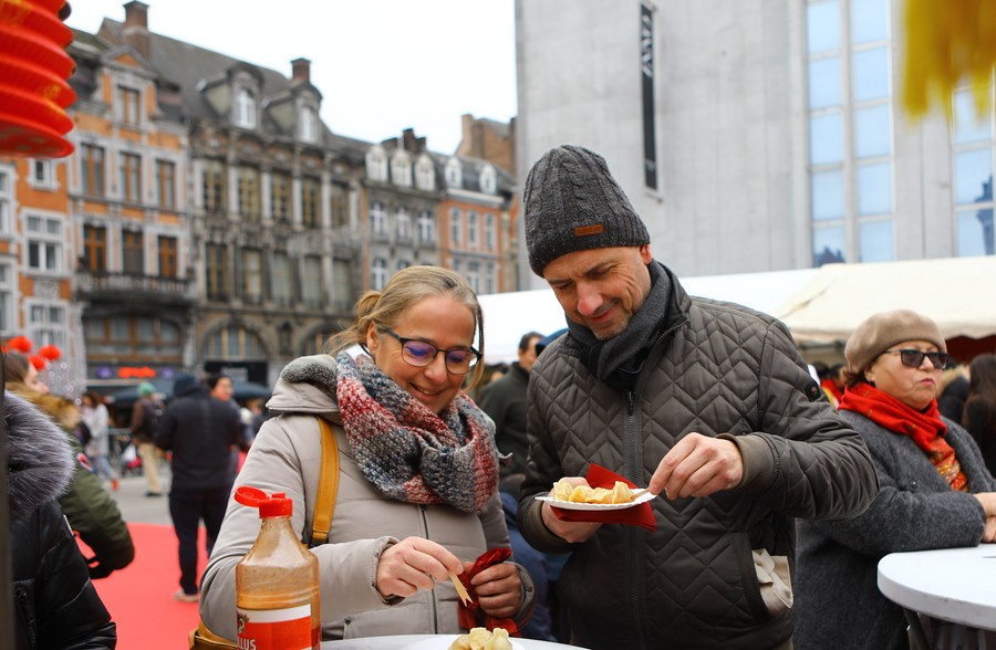 People taste Chinese snacks at a fair celebrating the Chinese New Year in Namur, Belgium, Jan. 28, 2023. (Xinhua/Pan Geping)