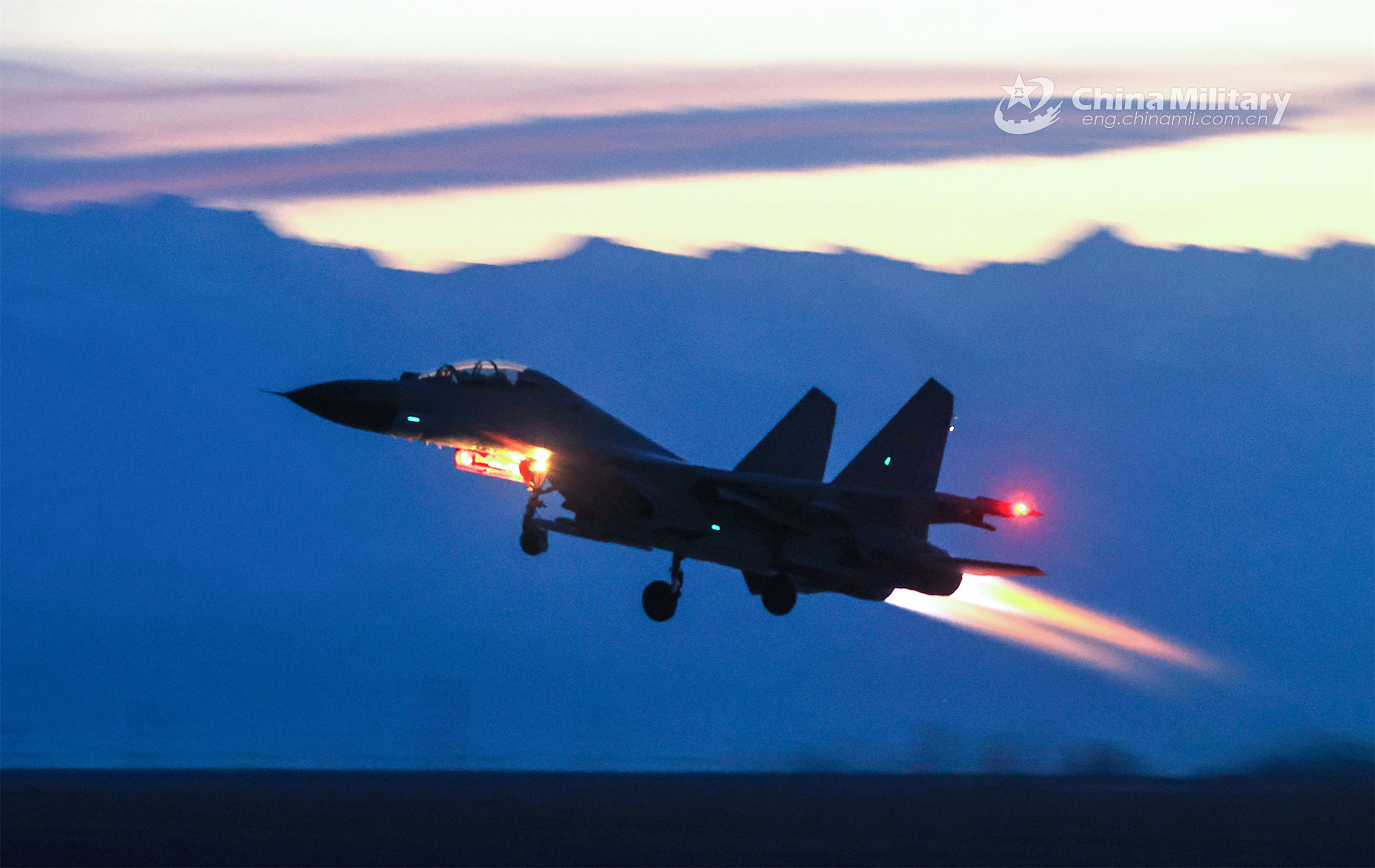Fighter jet attached to an aviation brigade of the air force takes off at sunset during a round-the-clock flight training exercise on March 31, 2023. (eng.chinamil.com.cn/Photo by Cui Baoliang)
