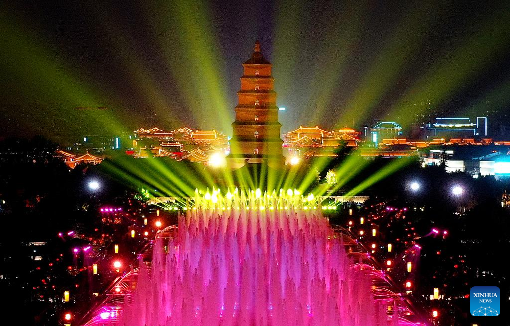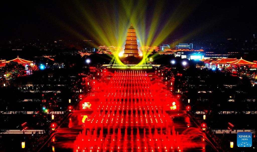 This aerial photo shows a music fountain show at the Dayan Pagoda scenic spot in Xi'an, northwest China's Shaanxi Province, April 18, 2023. (Xinhua/Liu Xiao)