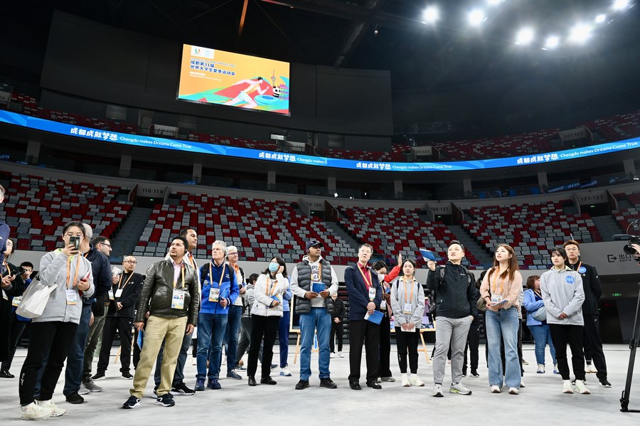 Participants of the Heads of Delegation (HoD) Meeting visit a venue at Dong'an Lake Sports Park in Chengdu, southwest China's Sichuan Province on March 28, 2023. (Photo by Liu Haiyun/Xinhua)