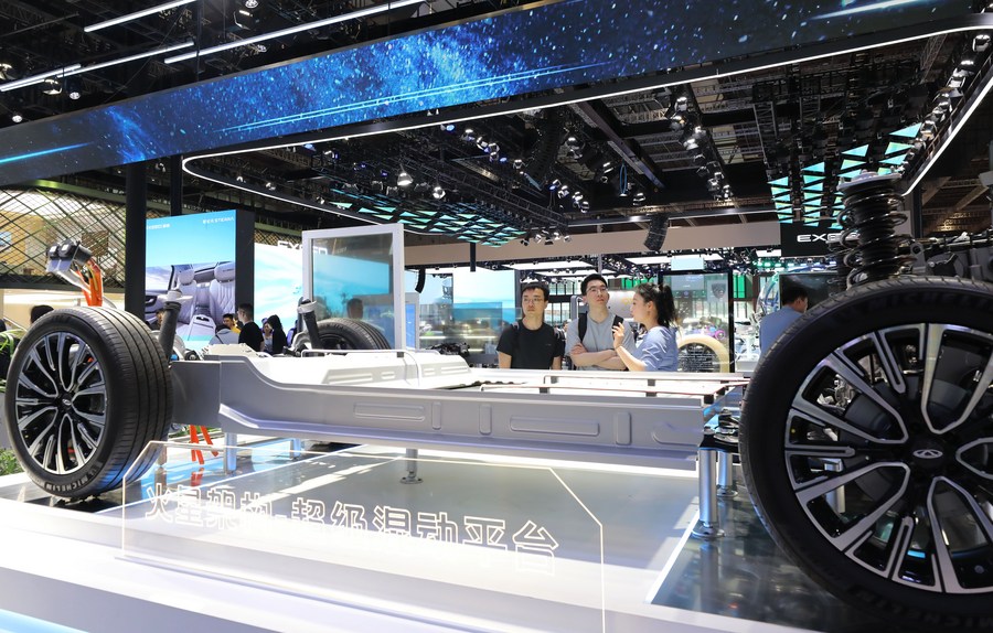 A staff member introduces a hybird platform of Chinese carmaker Chery at the 20th Shanghai International Automobile Industry Exhibition in east China's Shanghai, April 19, 2023. (Xinhua/Fang Zhe)