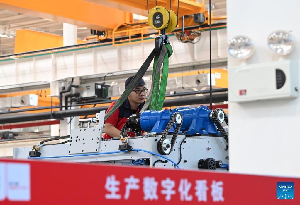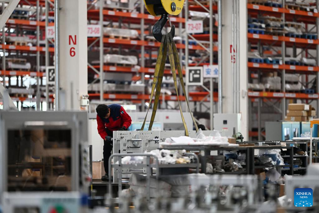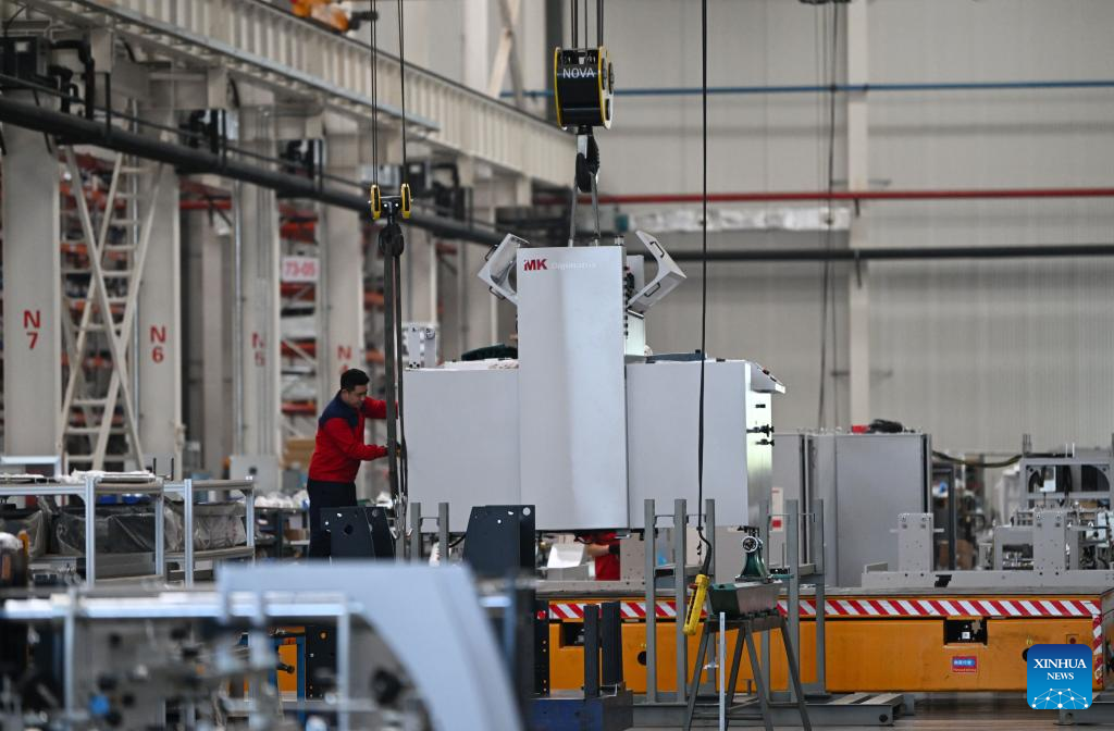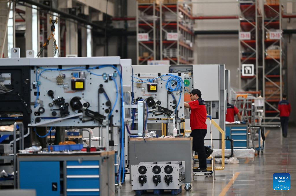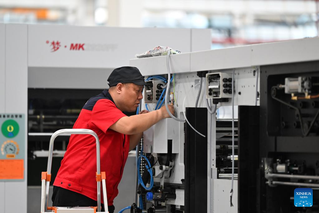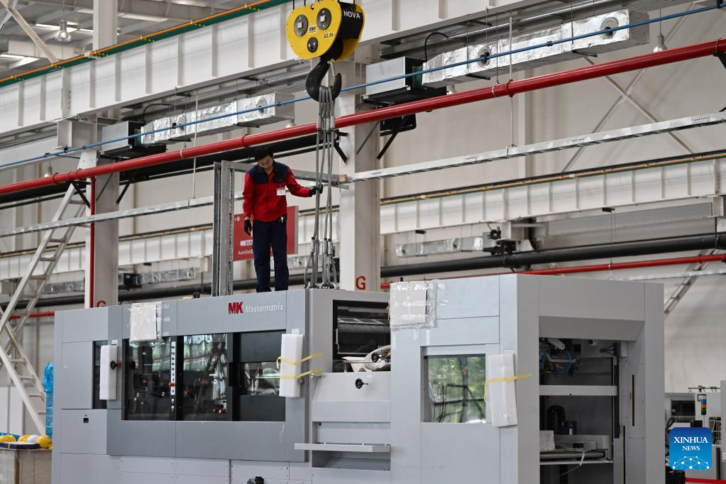 A staff member works at the production area of Masterwork in Tianjin, north China, on April 18, 2023. A die cutting machine of Masterwork can achieve an operation speed of 9,000 sheets per hour and have received many overseas orders in recent months. (Xinhua/Li Ran)