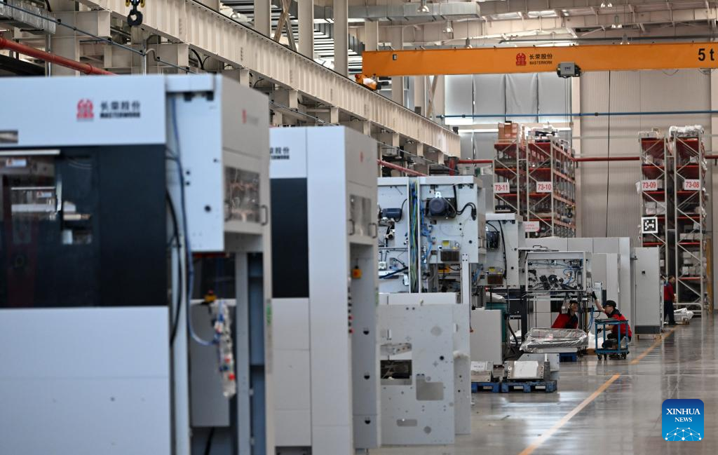 Staff members work at the production area of Masterwork in Tianjin, north China, on April 18, 2023. A die cutting machine of Masterwork can achieve an operation speed of 9,000 sheets per hour and have received many overseas orders in recent months. (Xinhua/Li Ran)