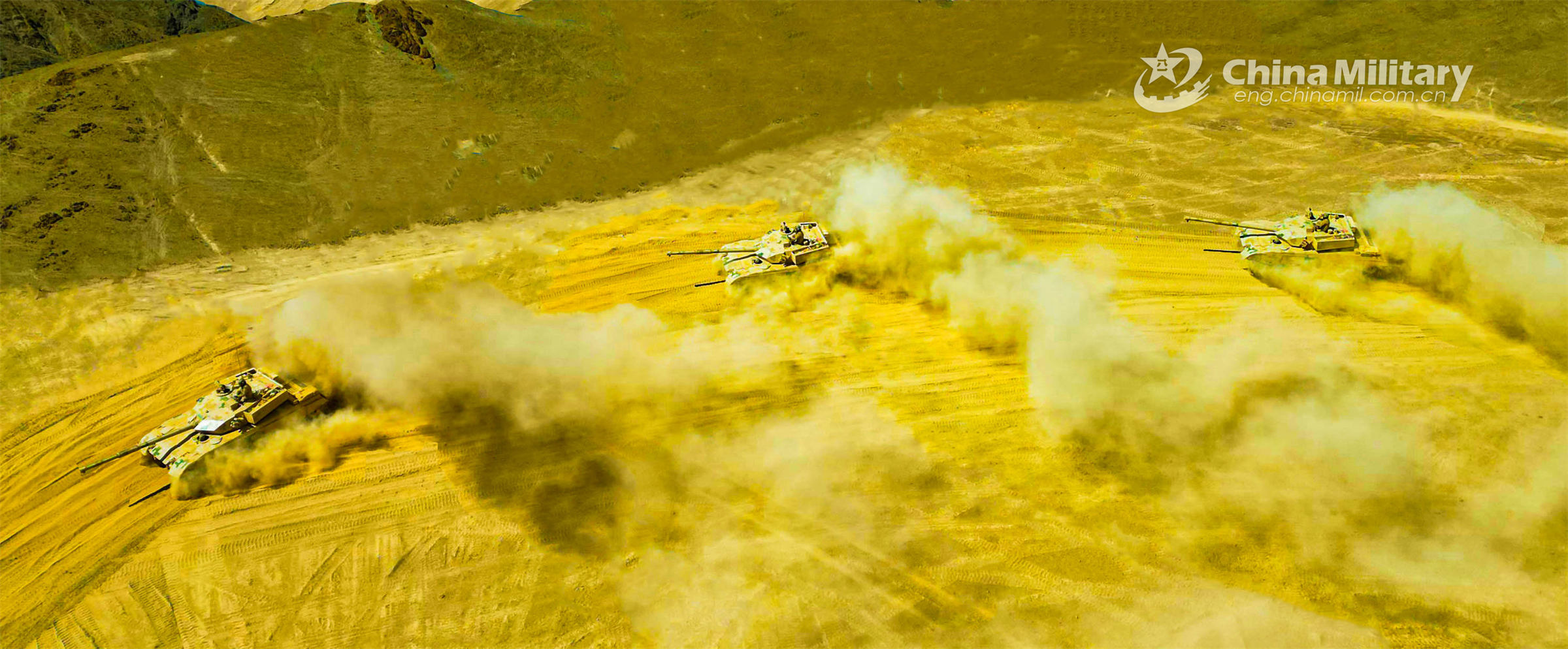 A convoy of armored vehicles attached to a brigade under the PLA 77th Group Army kicks up plumes of dust en route to a designated area during a tactical training exercise in late March, 2023.(eng.chinamil.com.cn/Photo by He Lijun)