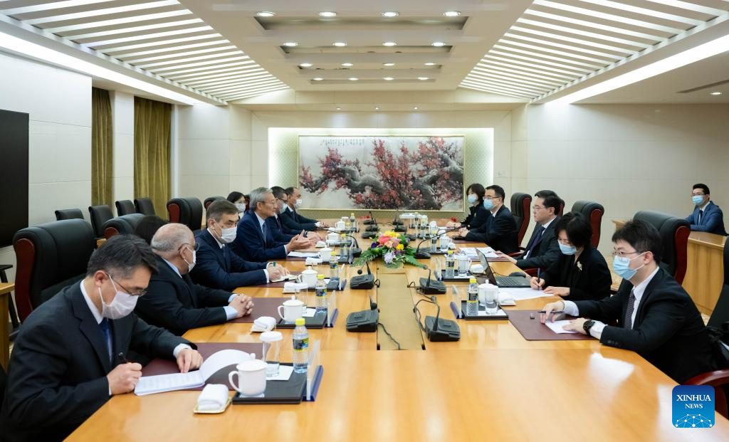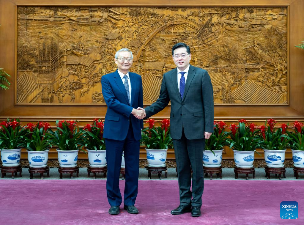 BEIJING, April 19 (Xinhua) -- Chinese State Councilor and Foreign Minister Qin Gang met with Secretary-General of the Shanghai Cooperation Organization (SCO) Zhang Ming in Beijing on Wednesday.