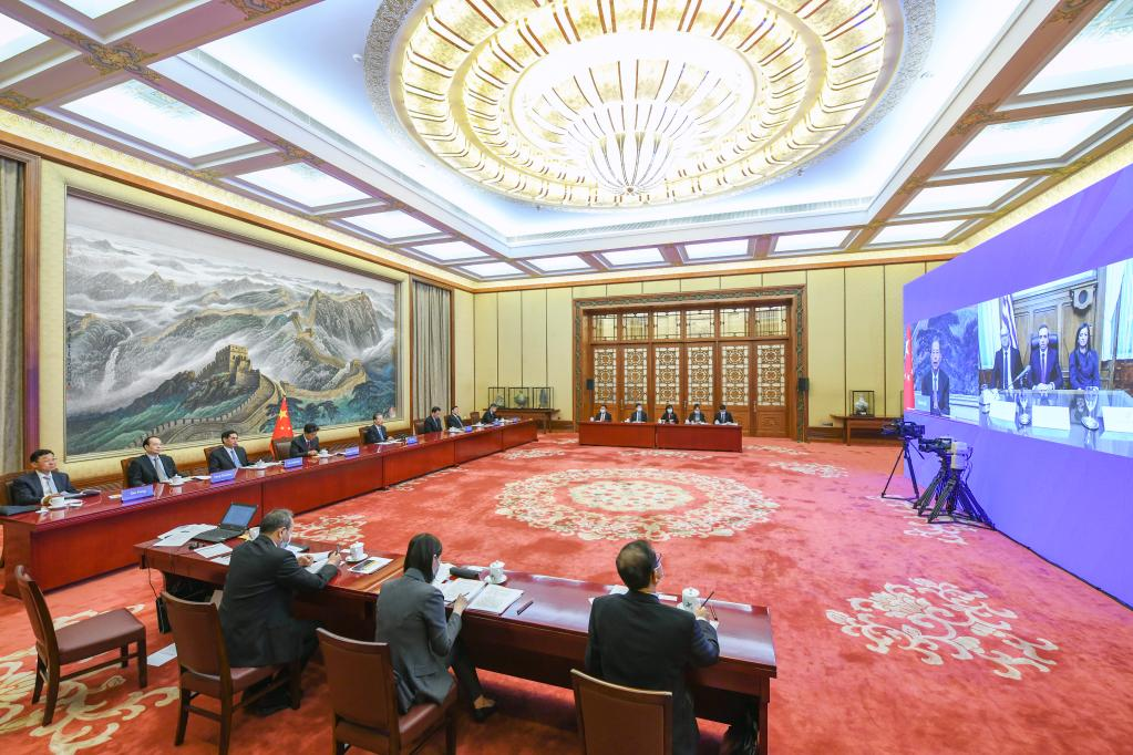 Zhao Leji, chairman of the Standing Committee of the National People's Congress, holds talks with the president of the Uruguayan House of Representatives, Sebastian Andujar, via video link at the Great Hall of the People in Beijing, capital of China, April 19, 2023. (Xinhua/Zhang Ling)