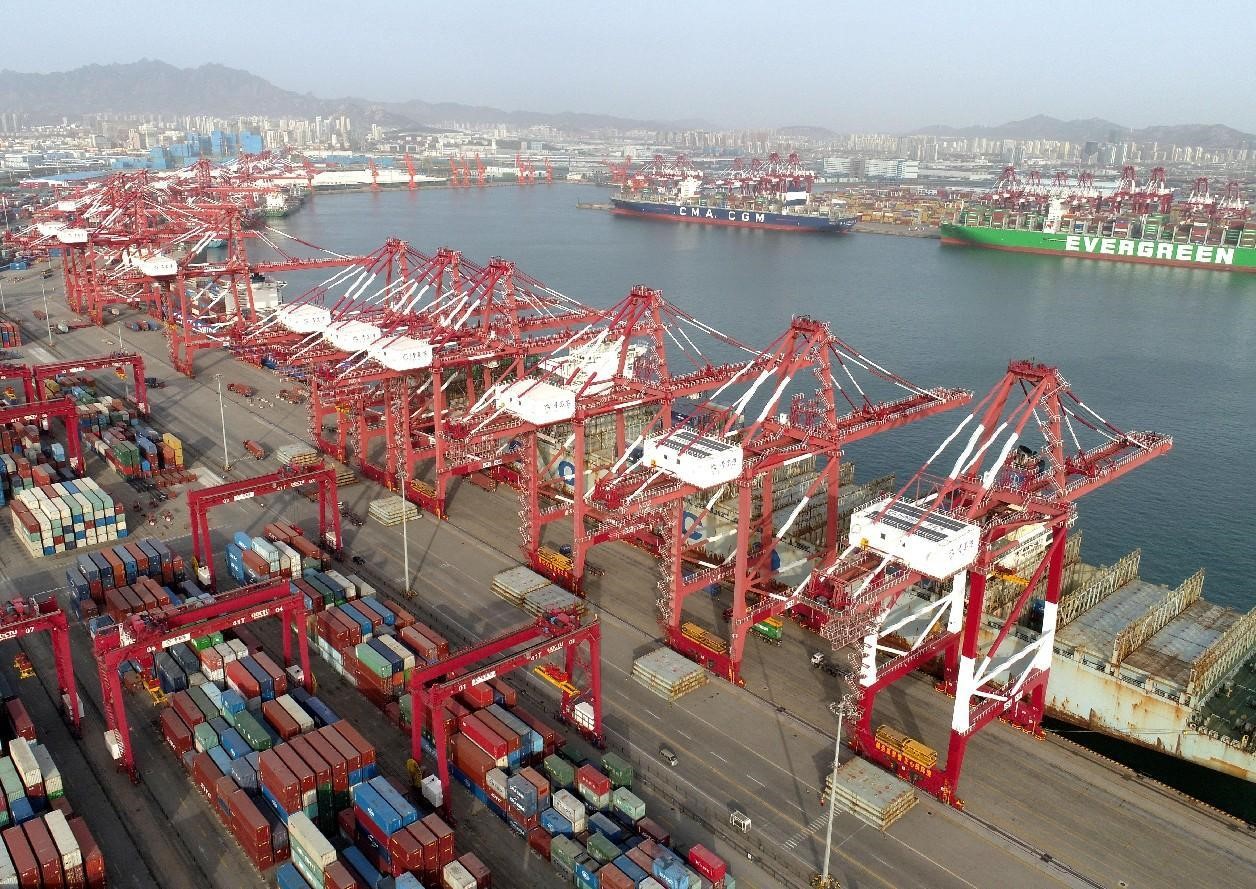 Containers are handled at the Qianwan Container Terminal of the Qingdao Port in east China's Shandong province. (People's Daily Online/Zhang Jingang)
