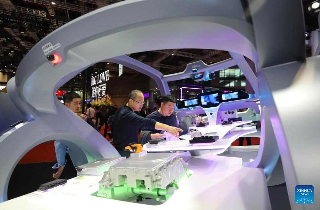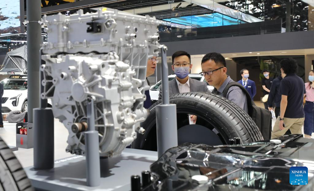 Visitors discuss while examining an NEV platform of Cadillac at the 20th Shanghai International Automobile Industry Exhibition in east China's Shanghai, April 18, 2023.?(Xinhua/Fang Zhe)