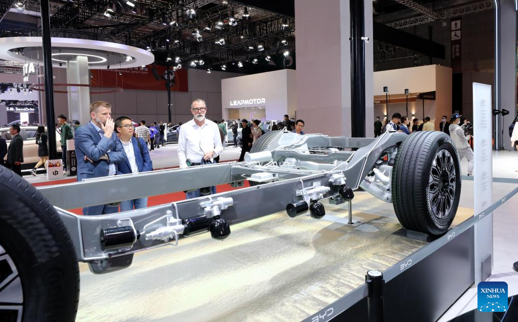An intelligent hydraulic body control system by Chinese carmaker BYD is displayed at the 20th Shanghai International Automobile Industry Exhibition in east China's Shanghai, April 19, 2023.?(Xinhua/Fang Zhe)