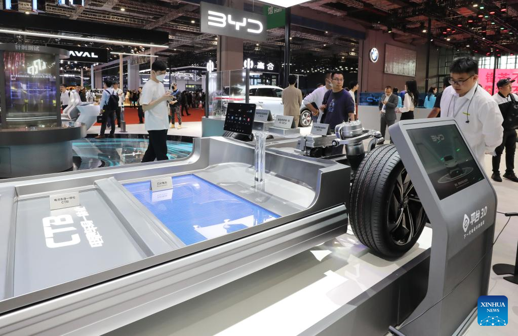 The CTB battery body integration technology of Chinese carmaker BYD is displayed at the 20th Shanghai International Automobile Industry Exhibition in east China's Shanghai, April 19, 2023.?(Xinhua/Fang Zhe)