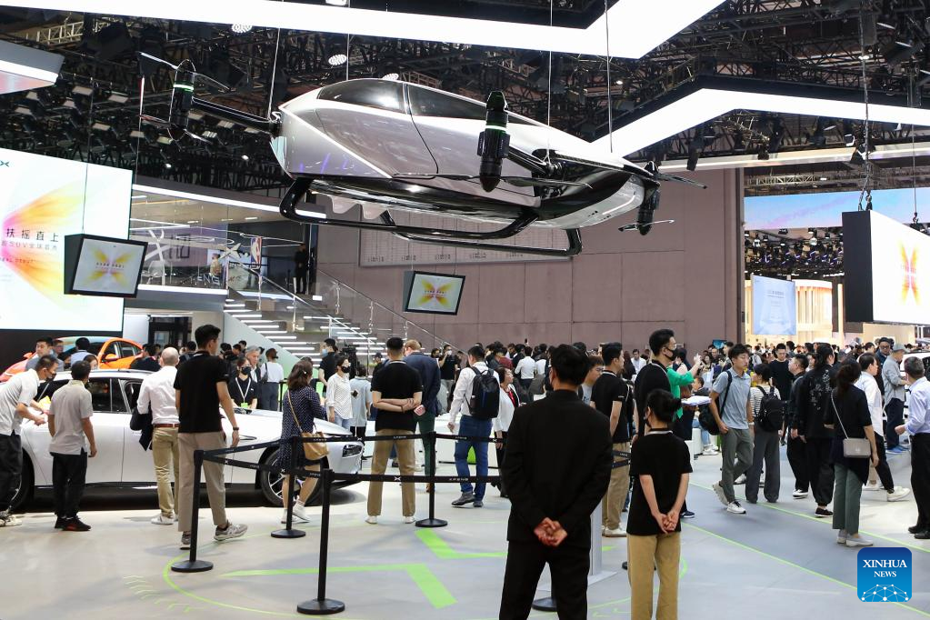 An XPeng X2 flying car is displayed at the 20th Shanghai International Automobile Industry Exhibition in east China's Shanghai, April 18, 2023. (Xinhua/Xin Mengchen)