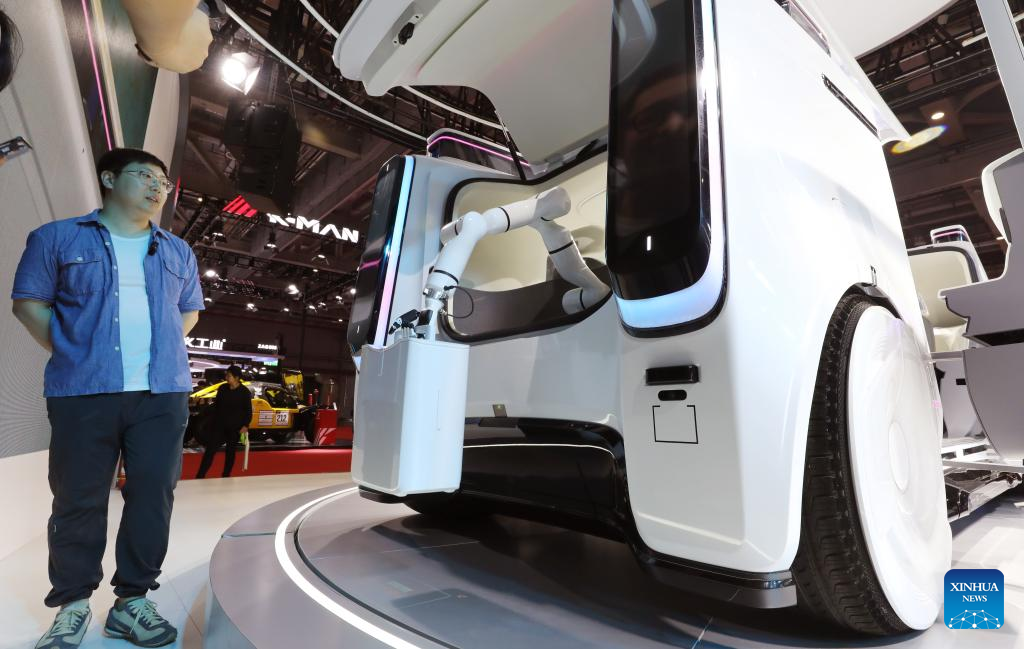 A visitor looks at an autonomous vehicle of DiDi at the 20th Shanghai International Automobile Industry Exhibition in east China's Shanghai, April 18, 2023.?(Xinhua/Fang Zhe)