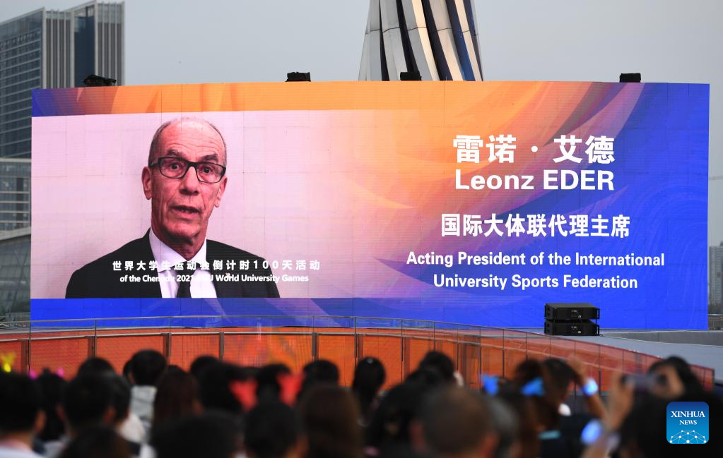 FISU acting president Leonz Eder addresses through video on the 100-day countdown event for the Chengdu 2021 FISU World University Games at Dong'an Lake Sports Park in Chengdu, southwest China's Sichuan Province, April 19, 2023. (Xinhua/Wang Xi)