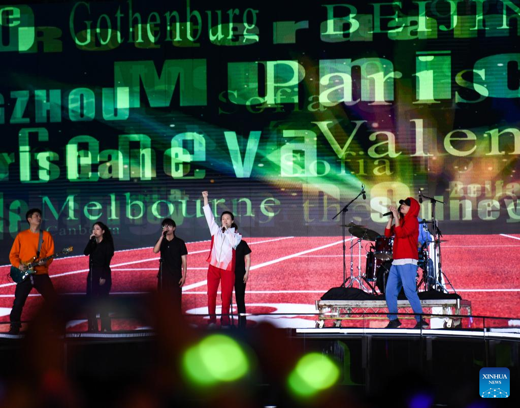 Students of Sichuan Conservatory of Music sing a song on the 100-day countdown event for the Chengdu 2021 FISU World University Games at Dong'an Lake Sports Park in Chengdu, southwest China's Sichuan Province, April 19, 2023. (Xinhua/Wang Xi)