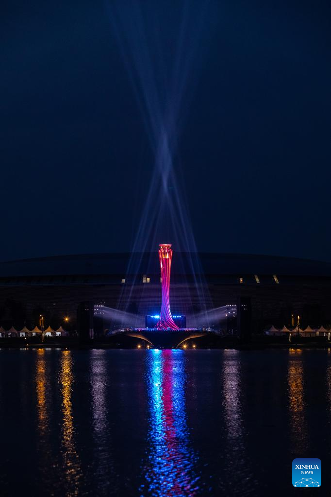 Photo taken on April 19, 2023 shows the stadium for the opening ceremony and cauldron in the light show for 100-day countdown to the Chengdu 2021 FISU World University Games at Dong'an Lake Sports Park in Chengdu, southwest China's Sichuan Province. (Xinhua/Shen Bohan)