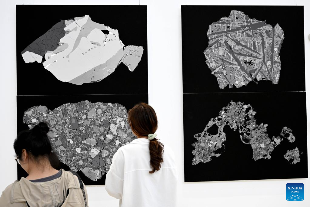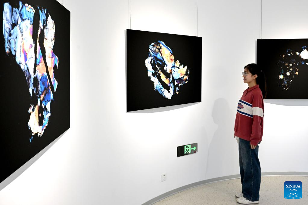A visitor views cross-polarized micrographs of lunar soil particles at an exhibition themed on lunar soil research achievements in University of Science and Technology of China, in Hefei, east China's Anhui Province, April 19, 2023.?(Xinhua/Huang Bohan)